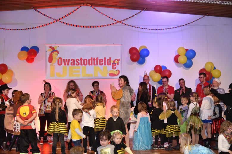 Der Vorstand der Owastodtfelder Igeln war mit dem 1. Kinderkarneval des noch jungen Vereins mehr als zufrieden. Zu Recht! Ein einziger Blick in das bunt dekorierte Bürgerhaus reichte, um sofort gute Laune zu bekommen. Denn in der Halle herrschte ein fröhlich-buntes Gewusel: Der Einladung zum großen Kinderkarnevalsnachmittag der Owastodtfelder Ijeln waren viele Kinder und Eltern gefolgt. Es drängelten sich kleine Prinzessinnen und Bienen, Indianer, Cowboys und Fantasiegestalten – auch Superman und Panzerknacker waren vertreten. Alles lief dank der guten Vorplanung bestens. Die 15 wilden Bienen (Trainerinnen Christiane May und Nicole Thömmes) begeisterten die Jecken genauso wie die kleine Garde Neroth (Trainerinnen: Jenny Hey und Eva Klaus) und die Kindergarde Stadtfeld (Trainerin Anna Nosbers, Betreuerinnen Simone Kober und Biggi Thömmes). Auch der Kindergarten Oberstadtfeld bot mit 22 Kindern eine lustige Mitmach-Geschichte für alle Zuschauer sowie ein Lied, bei dem die Kinder kräftig mitsangen. Die Auftritte der Mini Dreesklickerten (Trainerinnen Steffi Novara und Monique Broschek) sowie der vereinseigene Garde Oberstadtfeld (Trainerin Tabea Scholzen) erhielten ebenfalls viel Applaus.