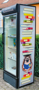 defekter Kühlschrank als Basis für den Bücherschrank gefunden. Nachdem Elektrik und Beklebung entfernt waren, konnte dank der Unterstützung von den Firmen CarSmartCenter (Oberstadtfeld), Eldiseño (Uersfeld) und bik.kreativ (Oberstadtfeld) eine neue Beklebung angebracht und so eine individuelle – und zum Dorf passende – Optik mit Igel 😉 geschaffen werden. Zudem ist die andere Seite als Dorfpinnwand konzipiert. Das bedeutet, das hier mit den vorhandenen Magneten Angebote und Gesuche aus und für das Dorf angebracht werden können, wie z.B. „Suche jemanden zum Rasen mähen“ oder „Verkaufe Gartenmöbel“ etc.