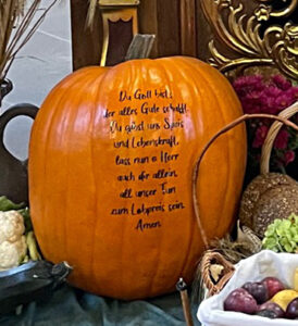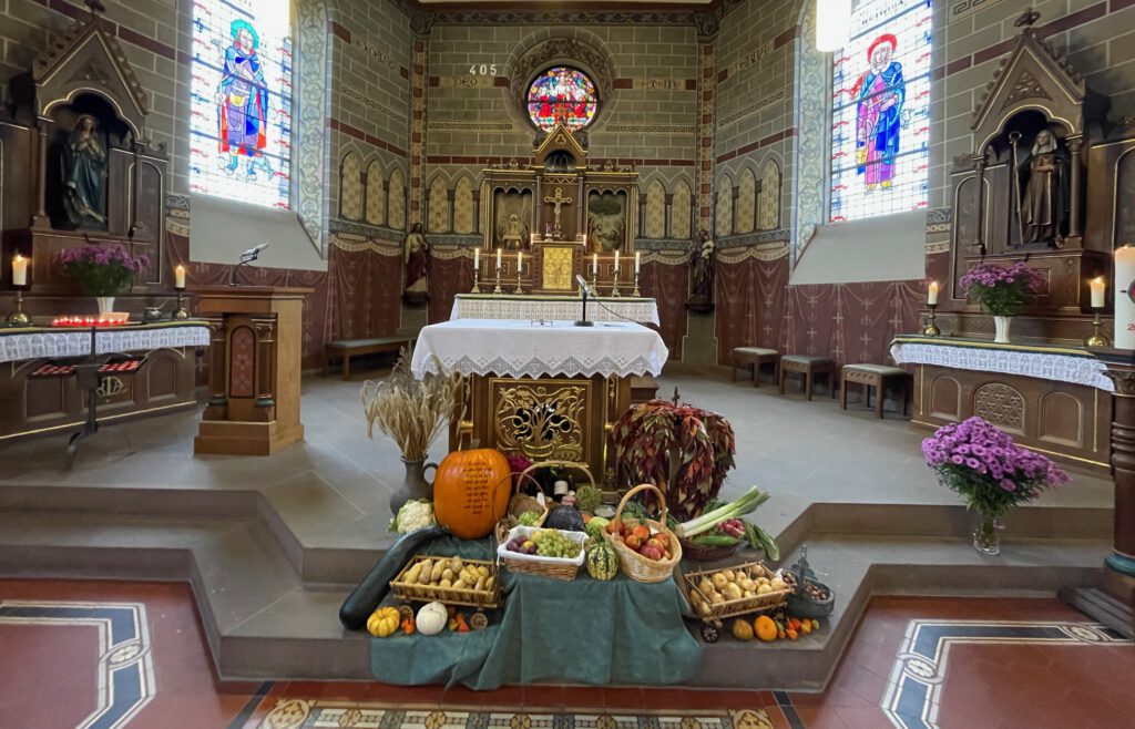 In unserer Kirche wurde von Agnes Würtz und Katharina Bauer ein wunderschöner Ernteteppich aufgebaut. Aus verschiedenen Obst- und Gemüsesorten, Nüssen und Getreide gestalteten die zwei im Altarraum unserer Kirche eine kunstvolles und aufwendiges Dekoration.