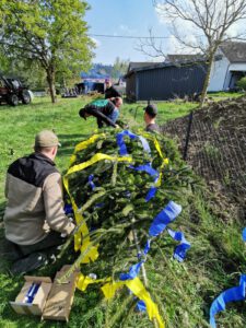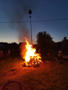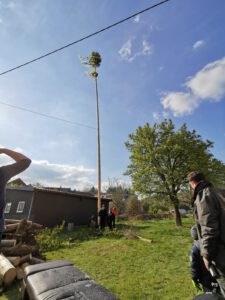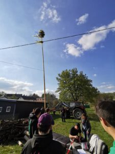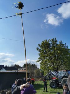 Traditionell konnte in diesem Jahr im Unterdorf der Maibaum 2022 aufgestellt werden. Endlich durfte auch wieder Publikum dem Spektakel beiwohnen, als die Dorfjugend den Baum gegen 17:30 Uhr am Vorabend des 1. Mai mit vereinten Kräften auf Position brachte. Die bunten Bänder in den Dorffarben, die an der Baumkrone befestigt sind, flattern jetzt hoch oben weit sichtbar im Wind und sind schön anzuschauen.